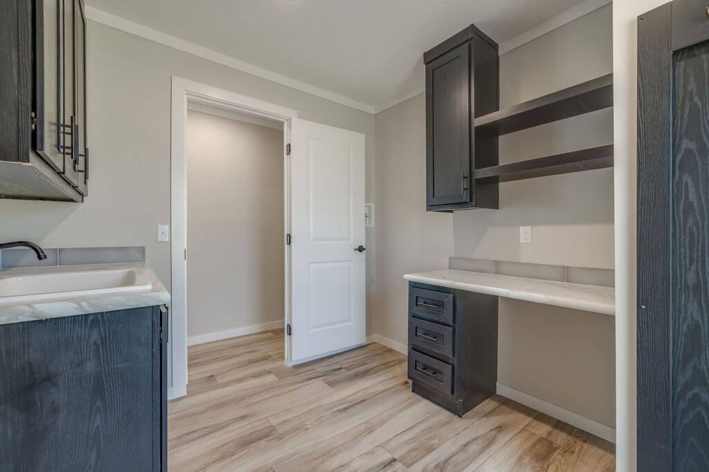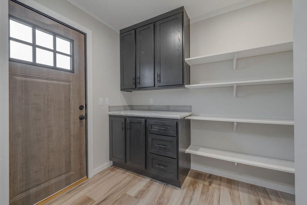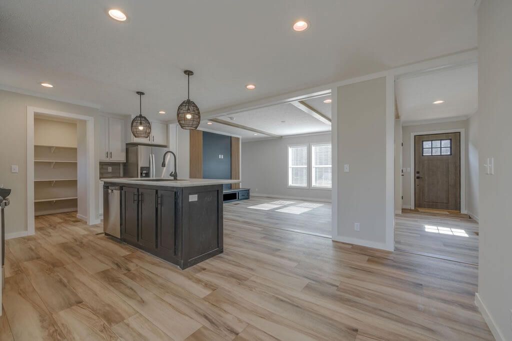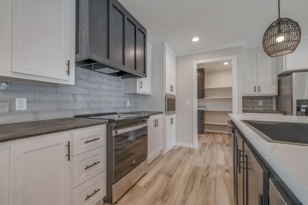 The kitchen shines with stainless steel appliances, a large center island, flat-top range, full tile backsplash, and an oversized walk-in pantry for ample storage. Modern black fixtures and hardware throughout the home add a bold, contemporary touch.