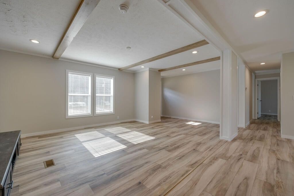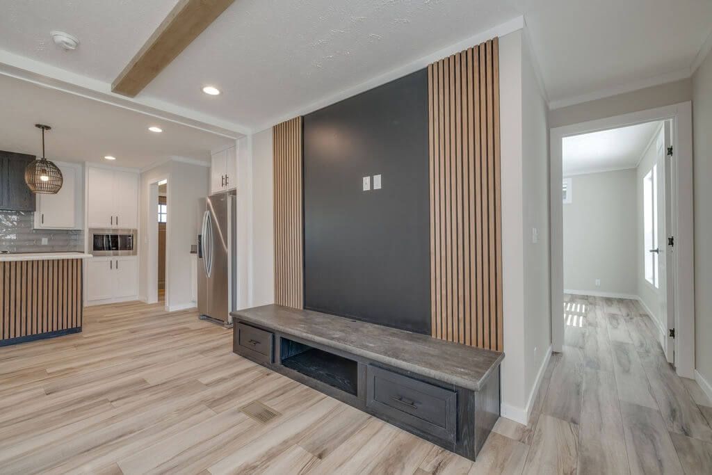 The open-concept layout seamlessly connects the kitchen, dining, and living areas, creating the perfect space for both entertaining and everyday living. A custom built-in entertainment center with wood slat accents adds warmth and a striking focal point.